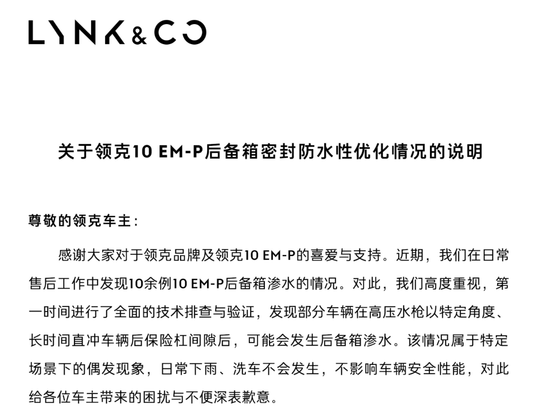 九游会私享:领克10 EM-P后备箱渗水遭投诉官方回应不影响安全